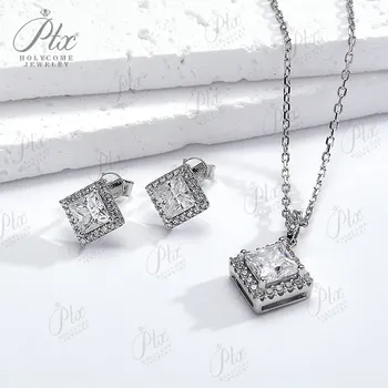 Prenses şekli D renk Moissanite 100% 925 ayar gümüş kaplama 18K kadınlar güzel düğün hediye küpe kolye takı setleri